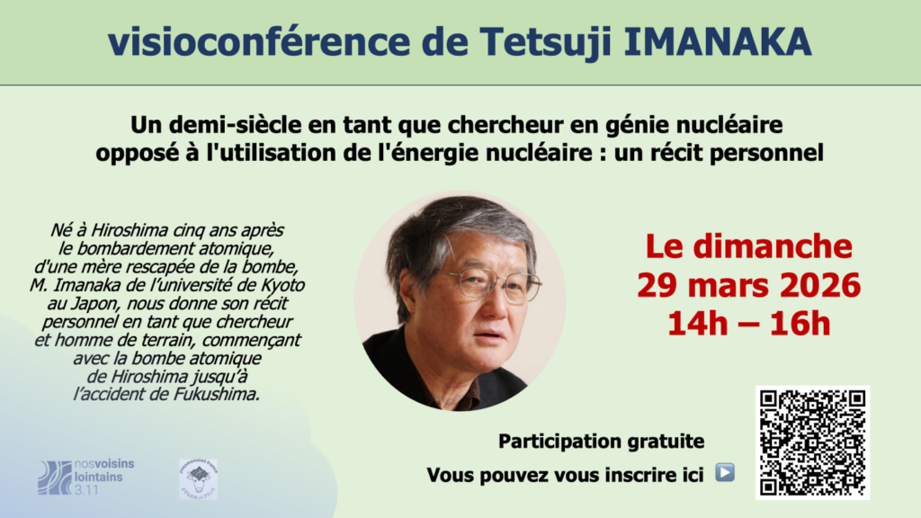 A l’occasion de 15 ans de Fukushima et de 40 ans de Tchernobyl, l’association Nos Voisins Lointains 3.11 organise une visioconférence de M. Tetsuji IMANAKA intitulée « Un demi-siècle en tant que chercheur en génie nucléaire opposé à l’utilisation de l’énergie nucléaire : un récit personnel« , en coopération avec l’association Yosomono-net France.