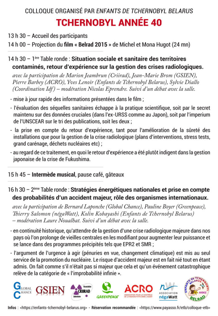 L’association Enfants de Tchernobyl Belarus a l’honneur de vous inviter à assister et participer au colloque « Tchernobyl, année 40 » qu’elle organise avec la participation de l’ACRO, la Coordination anti-nucléaire IdF, la CRIIRAD, Greenpeace, le GSIEN, Global Chance et négaWatt.