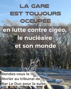 La gare est un lieu collectif historique de la lutte anti Cigéo. Achetée en 2007, elle a accueilli de nombreux évènements festifs et militants. Elle est aujourd’hui menacée d’expulsion à la suite des expropriations actuellement en cours, notamment le long de la future voie ferrée qui doit amener les déchets nucléaires dans le sous-sol de Bure.