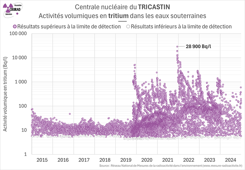 Sur la période 2015-2024, des valeurs dépassant 10 Bq/l ont été mesurées dans les eaux souterraines de 16 centrales sur 19 : plus de 1 000 Bq/l à Bugey, Gravelines et Tricastin ; plus de 100 Bq/l à Belleville, Blayais, Cruas, Dampierre, Flamanville, Penly ; plus de 10 Bq/l à Cattenom, Chinon, Chooz, Civaux, Fessenheim, Saint-Alban et Saint-Laurent-des-Eaux.